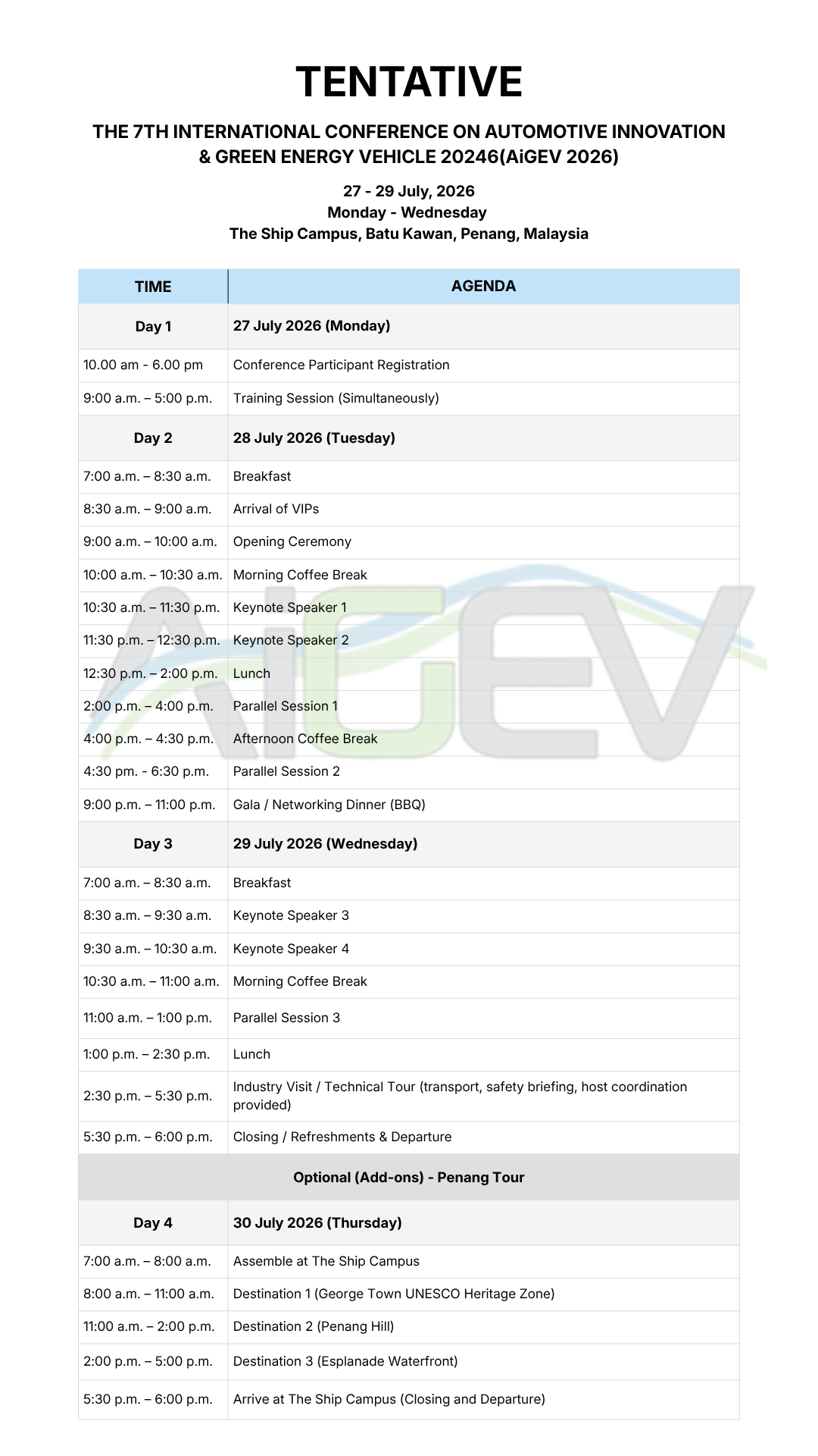 The 7th International Conference on Automotive Innovation & Green Energy Vehicle (AiGEV 2026), organized by AEC and UMPSA Advanced, is a premier platform uniting researchers, engineers, and industry leaders to share breakthroughs in sustainable mobility, EV technology, and green energy solutions. The 2026 edition in Penang emphasizes innovation, collaboration, and practical pathways toward a greener automotive future, aiming to provide a global platform for researchers, academicians, industry experts, and policymakers to share knowledge, research findings, and innovations in automotive engineering and green energy technologies, ultimately fostering collaboration toward sustainable mobility and advancing Malaysia’s role in the green automotive ecosystem.